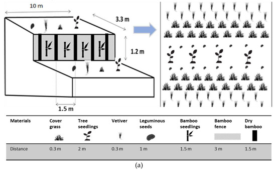 The technical specifications [23] were prepared in consultation with stakeholders and experts. They were followed to avoid unplanned activities, protect plant biodiversity, allocate resources efficiently and improve enabling conditions to implement landscape restoration in Cox’s Bazar south forest division. The activities and technical specifications were updated over time based on experiences, lessons learned and feedback from the different national and international agencies involved in landscape restoration activities. Figure 4 illustrates a representative example of schematic technical specifications and implementation of land stabilization activity on the ground. Specifically, the example demonstrates the use of multiple vegetation layers, including long-rooted grass species to stabilize topsoil, leguminous shrubs for increasing soil fertility, bamboo as living reinforcement on vulnerable slopes and fast-growing tree species for quick vegetation cover to reduce the risk of rainfall-induced landslides.