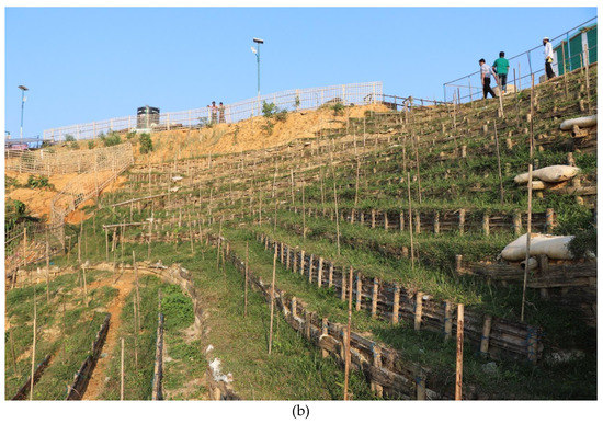 - Mahamud, R.; Arif, T.; Jalal, R.; Billah, M.; Rahman, L.M.; Rahman, T.; Iqbal, Z.; Henry, M. Technical Specification for Land Stabilization and Greening the Camp in Cox’s Bazar South Forest Division; Bangladesh Forest Department: Dhaka, Bangladesh, 2018; p. 52.