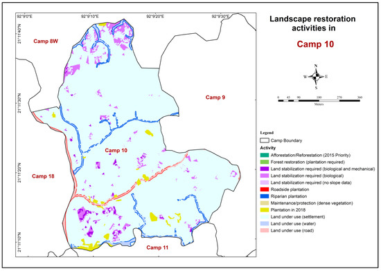 Suitable areas for landscape restoration were identified and published [29,30,31]. Depending on the emerging needs and updated data, the approach is under continuous revision. For instance, settlement footprints inside the camps and high-resolution (0.5 m) digital elevation models (DEM) were used for mapping suitable areas in 2019 inside the camp and new activities such as riparian plantation and roadside plantation were added, which were not included in the 2018 restoration plan. Table 4 presents the criteria for land suitability analysis for restoration activities inside the camps in 2019. Figure 5 shows an example map of a land restoration plan for a camp in 2019.
