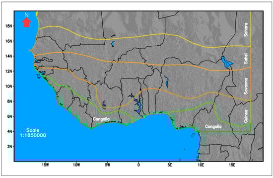 Map of West Africa showing five bioclimatic zones (adapted from [,,]).