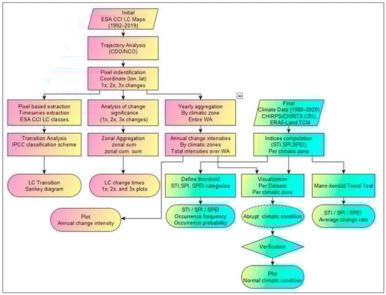 Despite the improvements in land–climate interaction research across the region using climate models, some problems remain. Typical are the methods of quantifying land–climate interactions, the spatial and temporal resolution of land cover datasets used in such studies, and the cost involved. Climate models are the preferred method of investigating land–climate interactions, but that is expensive and impossible without a high-performance computing infrastructure, causing the need for a cheaper approach. Secondly, most climate models investigating land–climate interactions use one year of historical land cover data, keeping it constant throughout the simulation period and neglecting the dynamic nature of climate–land interactions. Where dynamic land cover data are available, they are often very coarse, limiting their ability to capture important land cover features. The problems above are also significant challenges for the climate-modeling community in West Africa. Fortunately, the release of the European Space Agency (ESA) Climate Change Initiative (CCI) annual 300 m land cover (LC) maps are useful to improve the spatial and temporal resolution of land cover data used in climate models. The cost-effective approach for investigating climate–land interactions is, however, still lacking. The objective of this study is, therefore, to provide an alternative means of investigating land–climate interactions by quantifying the changes in land cover (using land cover trajectory analysis) and climatic changes (using the standardized temperature index (STI), standardized precipitation index (SPI), and standardized precipitation evapotranspiration index (SPEI)), and linking the two at comparable timescales. The need for this research is driven by the need to understand climate–land interactions in West Africa based on the prevailing land–climate interaction research questions. For instance, what kind of land cover change information could be learnt from the high-resolution ESA LC maps or any other land cover data? How could this information be a basis for parameterizing land cover changes to be fed into regional climate models in West Africa? Is there any link between the interannual climatic changes and the interannual land cover changes? Each research question provides a scientific contribution outlined below. Firstly, by studying the land cover information in the ESA LC maps, we determined through trajectory and transition analysis the major land cover conversions over West Africa to inform the climate modeling community what land cover changes were possible to simulate with the ESA LC maps. Secondly, the changes present in the ESA LC maps are also the changes ideally possible to use for parameterizing land cover changes in West Africa. Finally, in linking land cover changes to climatic changes, this work provides an alternative, less expensive method of investigating links between land cover changes and climatic changes without a climate modeling framework. While this work is in no way an alternative to robust climate modeling, we are optimistic that the outcome will provide important information on land cover changes and transitions for consideration by the climate modeling community in West Africa, specifically for parametrizing land cover changes to simulate their effects on regional climate (temperatures, rainfall, etc.). The proposed method could also be adapted and improved by the scientific community. This work is organized into three main sections. First, the interannual land cover changes were extracted from ESA LC maps from 1992 to 2019, followed by the computation of 12-monthly standardized climatic indices (STI, SPI, and SPEI) between 1980 and 2020. Finally, the links between land cover changes and climatic changes were determined.