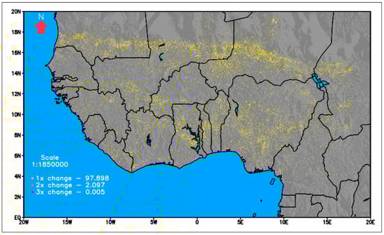 A trajectory analysis of the ESA LC maps from 1992 to 2019 shows 5,433,127 pixels have changed out of about 2.086 billion pixels (74.5 million pixels per year 28 years) analyzed over the West Africa domain (Figure 3). The changed pixels represent approximately 7.28% (488,981 km2) of the entire domain and consist of one-time changes (97.989%), two-times changes (2.097%), and three-times changes (0.005%). The remaining 92.92% (~5048,462 km2) is stable (unchanged).