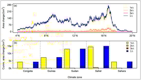 Land cover change area variation in West Africa categorized by (a) change frequency from 4° N to 20° N (b) cumulative change frequency per climatic zone.