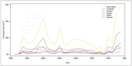 Annual variation of land cover change area for the five bioclimatic zones of West Africa.