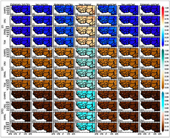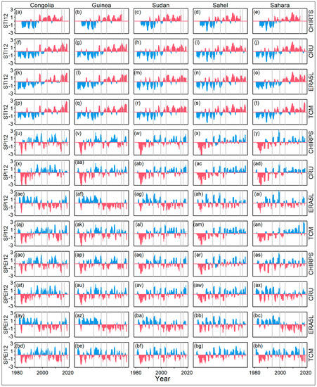 Figure A1 and Figure A2 compares the climatic conditions before abrupt land cover changes and climatic conditions during abrupt land cover changes respectively. Figure A1a–t, Figure A1u–an, and Figure A1ao–bg represent STI, SPI and SPEI conditions before the abrupt land cover changes were experienced. Similarly, Figure A1a–t, Figure A1u-an, and Figure A1ao-bg represent STI, SPI and SPEI conditions during which the abrupt land cover changes were experienced.