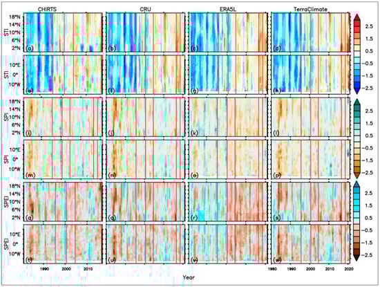 Time-latitude and time-longitude Hovmoller diagrams over West Africa showing that land cover changes (in red) coincide with abrupt climatic changes. (a–h) how STI values varies with time along the latitude and longitude respectively for CHIRTS, CRU, ERA5-Land, and TerraClimate datasets. (i–w) how STI values varies with time along the latitude and longitude respectively for SPI and SPEI.