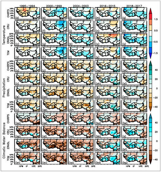 The wet and dry conditions in Table 4 are presented in this way to emphasize that similar temperature changes with contrasting precipitation and water balance (Figure 9; 1995–1994, 2016–2015) effects have similar effects on land cover area change (Figure 6; 1995, 2016). The results also reveal that a positive increase in temperature everywhere in the region may have less impact on total land cover area change than contrasting changes with a decrease in some regions and increases in others, or a change in temperature from cold (hot) conditions to hot (cold) conditions across a region. This is evident in Figure 9 and explains why a change of 0 to 1.5 °C has less impact on land cover area changes (20,935–22,127 km2) than −0.5 to 0.5 °C changes (31,843 km2). A change of −1.0 to 1.0 °C, however, relates to a greater land cover area change than −0.5 to 0.5 °C. The climatic conditions before and during abrupt land cover changes are shown in Figure A1 and Figure A2 respectively in the appendix section of the manuscript.