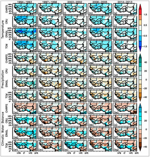 In Figure 10 below, we quantify the climatic conditions in normal years to verify if indeed abrupt changes in climatic conditions, as asserted above, lead to abrupt land cover changes. In general, the temperature change ranged mostly between covering 50 to 90% under normal climatic conditions (Figure 10a–t) for CHIRTS, CRU, ERA5-Land and CRU datasets. Similarly, changes in precipitation (Figure 10u–an) and climatic water balance (Figure 10ao–bg) ranged between −20 and +20 mm covering over 80% of the West African domain for CHIRPS, CRU, ERA5-Land and TerraClimate datasets. These climatic conditions are well below the conditions for which abrupt land cover changes were experienced, with a total land cover area change of less than 20,000 km2.