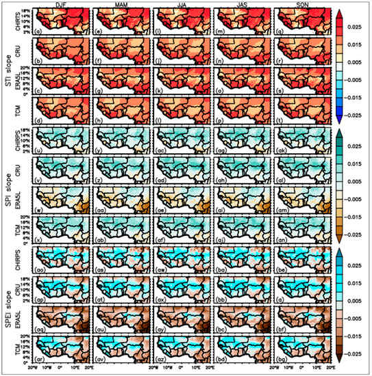 The seasonal Mann–Kendall slope (Figure 11) suggests that the climatic indices are changing at a rate that varies from −0.025 to 0.025 per year between one region and another. For STI the changes are positive (0 to 0.025) everywhere for all the datasets, and suggest that temperature is increasing everywhere within West Africa from 1980 to 2020 and also for all seasons (Figure 11a–t). The SPI (Figure 11u–an) and SPEI indices (Figure 11ao–bg), on the other hand, suggest an increase in precipitation mostly in the Sudan and Sahel zone, with few changes in the Guinean and the Sahara zones. Three datasets (CHIRTS/CHIRPS, CRU, TCM) show similar decreases based on their SPEI values, except that the decrease is much greater than seen for the SPI. ERA5-Land, however, shows significant decreases based on the SPI and SPEI values.
