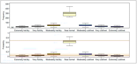 The occurrence frequency and probability of occurrence of the various climatic conditions are shown in Figure 12 and Figure 13, respectively, below. Based on both parameters, the West African region is subjected mainly to a normal climate with an average probability of occurrence of about 0.6 for all the datasets. The occurrence frequencies and probability of occurrence both decrease further with a departure from the normal climate consistent with theoretical values in Table 2 and Table 3. We summarize here the probability of occurrence and the occurrence frequency of the climatic conditions for all three climatic indices using boxplots (Figure 14), where the horizontal lines in Figure 14b are the theoretical probability of occurrence. The spatial representation of these frequencies and probabilities for the various indices over West Africa are also shown in Figure 12 and Figure 13.