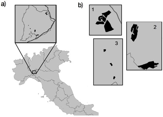 Study area: (a) Geographical location of the SCI “Sassi Neri-Pietra Corva” in the Northern Apennines (Lombardy region); (b) shape and location of the nine semi-natural grasslands belonging to EU habitat type 6510 within the study area: (1) 9.53° E, 44.83° N; (2) 9.34° E, 44.81° N; (3) 9.33° E, 44.81° N.