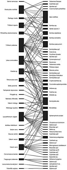 We investigated grasslands characterized by a small number of strong interactions and many weak interactions (Figure 2). The plant species involved in the greatest number of interactions were Onobrychis viciifolia Scop. And Trifolium pratense L. The most active pollinator species were Apis mellifera, Bombus pasquorum, Bombilida atra and Sphaerophoria scripta. The strongest (i.e., with the greatest interaction strength) pollinator species were Sphaerophoria scripta, Bomylidae atra and Apis mellifera. These pollinators were also involved in the greatest number of interactions (Figure 2 and Figure 3a). Among the plant species found in this habitat, Trifolium pratense L. and Leucanthemum vulgare Lam. Were the most important for pollinators, showing high strength and high frequency of interaction, followed by Carum carvi L., Lotus corniculatus L. and Knautia sp. (Figure 2 and Figure 3a).