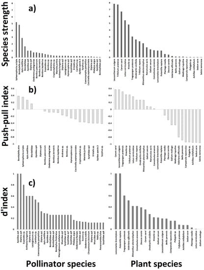 Species descriptors used to characterize the role of each species within the network; calculated taking into account the interaction strength between plants and pollinators: (a) Species strength: provides a quantitative measure of the importance of a species for its partners; (b) Push-pull index (Species interaction asymmetry): provides a measure of the imbalance between the effect that a species has on its partners and the dependence of that species on their partners; (c) d′ index (Generalization-Specialization) provides a measure of the level of a species specialization taking into account the relative abundance of its partners. Plant species authority is shown in Table S1.