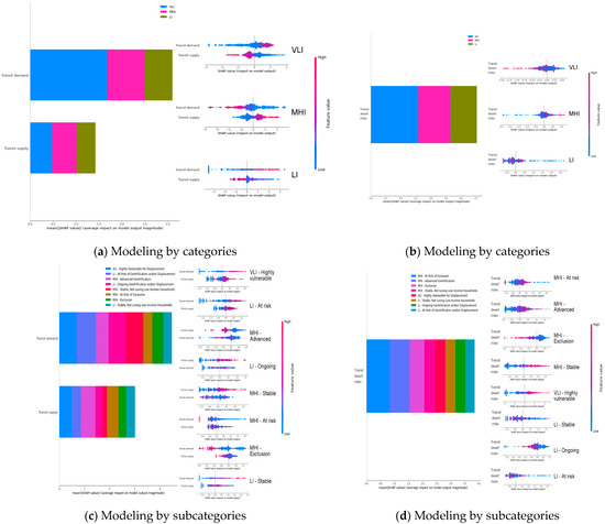 Figure 2c,d present the results by subcategories. Similar to the above results, the importance of transit supply is globally lower than demand, but in some cases, the contribution of transit supply is larger than transit demand, including MH—Advanced, LI—Ongoing, and MHI—Stable. In addition, focusing on the impacts of transit demand, we claim that high transit demand could contribute to defining neighborhoods as VLI, LI—At Risk, and LI—Stable, and low transit demand could be related to MHI—Advanced, MHI—At Risk, and MHI—Exclusion. In addition, transit supply in LI—At Risk, LI—Ongoing, MHI—Stable, and LI—Stable neighborhoods could be higher than the others, while in MHI—Advanced neighborhoods, it could be significantly lower. Figure 2d presents the results of the transit desert index. It indicates that a high transit desert index could be related to neighborhoods defined as MHI—Stable and VLI, while a low transit desert index could happen in MHI—Exclusion and all LI group neighborhoods.