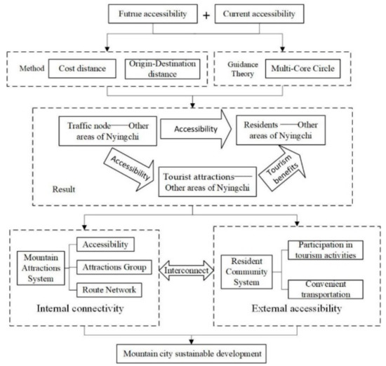 Most of the studies on the accessibility of mountain tourism focus on “traffic-tourism interaction”, the spatial pattern of accessibility, the spatial and temporal compression effect of railroads, and the impact of the backbone traffic network on tourism. In this paper, under the guidance of multi-core theory, we discuss the linkage between the mountain attractions system and the resident community system, which can effectively provide direction for local residents to participate in tourism activities. In addition, the development of ecotourism is sustainable for mountainous areas, which can generate positive economic benefits for local communities and take advantage of tourism, and then residents can perform diversified tourism activities to provide tourism economic benefits for local communities. In addition, as a frontier region, the prosperity and stability of the people in Nyingchi is related to the stability of the society, and the enhancement in the accessibility of scenic spots is also significant to stabilize and flourish the frontier.