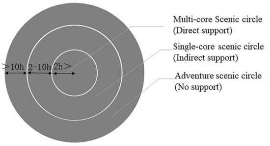 V. Smith extended Friedman’s “core-edge theory” to the study of tourism areas, arguing that tourism areas consist of three parts: core areas, direct support areas, and indirect support areas, with the core tourism area as the center, and the dependence of the periphery on the central scenic area decreasing with increasing time costs. The actual itinerary route is often composed of a series of tourist attractions, and the proportion of “time spent in spatial movement” and “time spent at tourist attractions” largely affects tourists’ tourism experience. According to the idea of time geography, people not only pursue minimizing the time of spatial movement but also emphasize the effective staying time at spatial points. The time spent at major tourist attractions should be at least 2 h, the rest of the tourist attractions should be approximately 0.5 h, and the average visit time of tourists should be 8–10 h. Nyingchi is rich in the types of tourist attractions, and there are diverse route options according to different visiting times. Based on the existing route arrangement statistics, excluding the first and last two days, the average number of major tourist attractions visited in Nyingchi is 2.42 per day; therefore, when the traffic distance between tourist attractions is within 2 h, it is possible to visit 2–3 tourist attractions in the same day, which does not easily make tourists feel tired; when the traffic distance increases to 2–10 h, 1–2 tourist attractions can be visited, but most of the time has been cost in traffic; when the distance is more than 10 h, it has exceeded the average visit time of tourists, and tourists cannot visit or can only visit small roadside tourist attractions, and will feel quite tired physically and mentally (Figure 3).