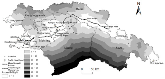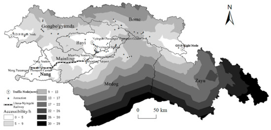 Tourism, as the leading industry development of Nyingchi in the future, will have a great influence on the local resident [56]. As the residential areas are the basic unit for providing tourism services, they are the main body that receives tourists, absorbs employment, and develops the tourism economy. The nearer the residential areas are to the tourist attractions, the higher revenue is from tourism and the higher the growth of local residents’ income, which cultivates local tourism and drives up the living standards of people in the region [57]. Meanwhile, the local construction, management, and catering of scenic areas can shape a unique sense of place, bringing visitors an extraordinary experience. The accessibility of residential areas to tourist attractions can be expressed in terms of time, and the improvement of roads has increased the accessibility of residential areas, so that the accessibility of residential areas in all counties/districts will be less than 5 h, except for Zayu County, Medog County, and some residential areas in Bome (Figure 8).