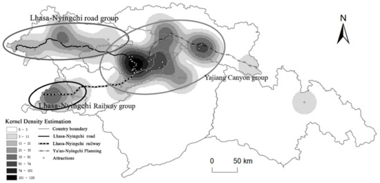 Based on the spatial location and future traffic accessibility of tourist attractions, points with nuclear density values of tourist attractions above 10 were selected as a cluster, and the standard deviation ellipse analysis is done separately to get the tourism cluster division (Figure 8), which roughly divides the tourist attractions in Nyingchi into three major clusters.