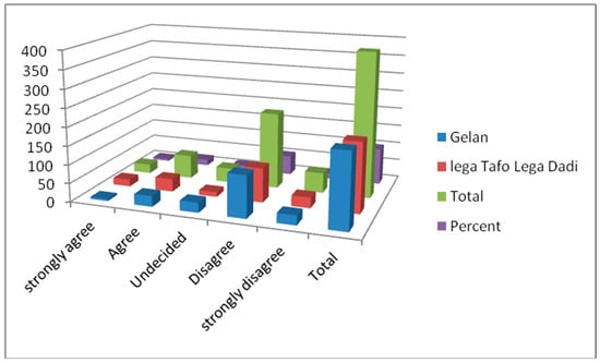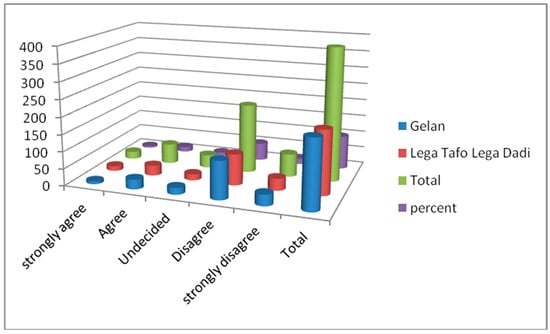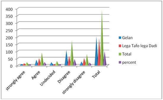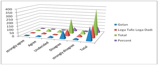 According to interviews with key whistleblower groups, problems with corruption were commonly found in the urban land administrations of the cities of Lega Tafo, Lega Dadi, and Gelan. These were found to be related to systems for land certification papers, the lack of integrated urban land information systems, and inappropriate urban land valuation, the lack of good governance values among staff, and income from land. The data showed that the municipal property tax was traditionally the main source of revenue for both municipalities. This indicated that land registration revenues increased since land regulation had recently started in some zones. In both towns, there was no rating system, and there was a lack of reliable information about the urban real estate market and of a specialized workforce; the use of inappropriate valuation methods led to undervaluation of properties, which was related to the social behavior of the land staff. Consequently, the revenue collected by the state was less than the actual revenue that it could generate. However, complicated procedures for certifying city lots and high transaction costs kept transactions from being registered, and the undervaluation of lots in the towns also reduced potential revenue. Issues such as bribery, fraud, and misconduct existed in both towns, as revealed by the focus group discussions with certain respondents. This indicated that the urban land management in both towns was not free from problems. However, Lega Tafo Lega Dadi had more problems than Gelan according to these polls. As indicated in Table 3, respondents were asked to rate their opinions on the effects of urban land management on the social behavior of urban land staff. A total of 225 (57.5%) and 57 (14.6%) of the respondents answered “disagree” and “strongly disagree”, while 53 (13.6%) and 18 (4.6%) of the respondents answered “agree” and “strongly agree”, and 38 (9.7%) of the respondents answered that they had doubts. Thus, from Table 3, it can be stated that the majority (225 (57.5%)) of the respondents confirmed that there were problems with the social behavior among urban land management employees as a result of weak governance. This implied that there were problems with the social behavior among urban land management employees as a result of weak governance.