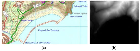Original contour lines map of Las Teresitas beach (a) and height map (b).