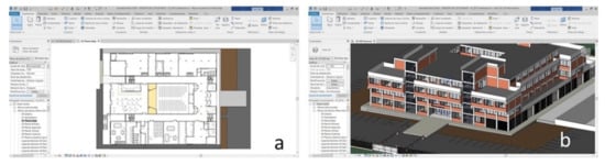 On the other hand, for the creation of the virtual environment in the indoor workshop, we had 2D engineering drawings in AutoCAD from the Faculty of Building Engineering of the University of La Laguna, provided by the Technical Office of the University. From these 2D floor drawings (Figure 3a) in AutoCAD, 3D models (Figure 3b) were created using the Autodesk REVIT 2022 Building Information Modeling (BIM) application (free educational license). The BIM model was made including the plot, a fence to delimit its limits and the basic furniture of some of the building’s rooms. Textures were included on the walls and on the window panes (Figure 4). BIM designs can be exported to game engines such as Unity 3D for real-time walkthroughs. In this way, the design of an architectural space can be visualized in a faster and more realistic way than with conventional 2D floor drawings [,,,,,,].