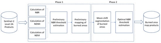 The proposed approach aims at delineating burned areas by employing an unsupervised local thresholding approach that discriminates the pixels in the study area into burned and unburned classes. The flowchart of the proposed approach can be found in Figure 2. By making use of the dNBR index, the methodology proposed also offers the capacity to differentiate between different levels of damage severity based on the index values of each pixel. The damaged regions can be further divided into low severity (or possibly damaged) and moderate severity (or damaged), with these further divided into moderate–high and moderate–low severity in this study, and high severity (or destroyed), as per the established dNBR damage severity scales (as described and widely used in [10,44]).