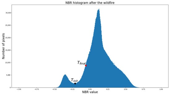 The histogram of the NBR index after the fire (NBRafter) is calculated and is used to estimate an initial threshold Tinit, which is defined as the first deep valley of the NBRafter histogram. Tinit is used to perform a rough separation of the scene into core burned (low NBR) and mildly burned or unburned areas (high NBR). If a pixel p has NBRafter(p) < Tinit, then it is classified as burned; otherwise, it is classified as unburned. As a result, an initial burned area map can be generated, containing pixels with a high probability of being burned, using the threshold Tinit (Figure 3).