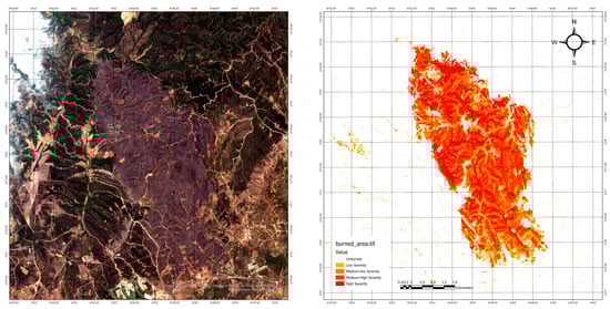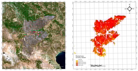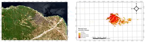 In this study, our focus was on the ability of the proposed approach to discriminate between burned and unburned areas. However, in view of a comparison against the benchmark results of CEMS, thresholds, suggested by USGS for dNBR interpretation [10] and adjusted by CEMS in fewer classes [44], are applied and finer fire impact severity classes could be mapped (see Figure 5, Figure 6 and Figure 7). Classes of interest concern destroyed, damaged and possibly damaged areas. This is a more simplified scheme followed by Copernicus, where pixels of the moderate–low- and moderate–high-severity subclasses are grouped into one class, i.e., the damaged (moderate) class [44]. In this study, both subclasses (moderate–low and moderate–high) are presented, since the suggested thresholds for both are applied and the need for a fire to be described in more detail is considered.