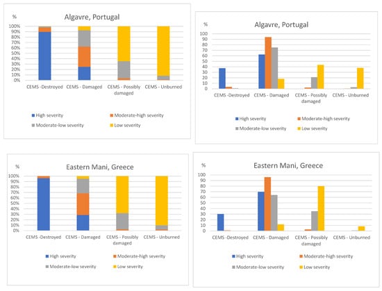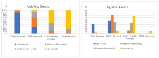 Regarding the classification of the areas into different damage severity classes, the main obstacle was that validation maps could not be accurately provided by visual interpretation, as was possible with the distinction into burned and unburned areas. As a result, the comparison that could be performed was with the CEMS classes provided. As a result, a complete accuracy estimation for the damage severity classification of the proposed approach could not be performed. However, it seems that the distribution of the percentages into the different classes between events varies only slightly, demonstrating that the results are consistent across the various events.