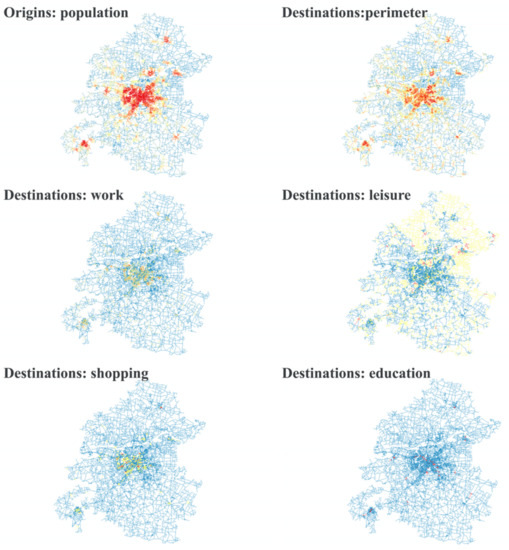 Here, it was useful to apply the concept of “gravity fields” to the functional–spatial structure. A model of the structure was created, in accordance to Objective 1, referring to the space syntax approach of B. Hillier. However, in contrast to Hillier’s models, data stratified in terms of specific spheres of city life, relating to the basic daily needs of the inhabitants, were used. In the second step, the origins and targets of trips were identified.