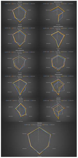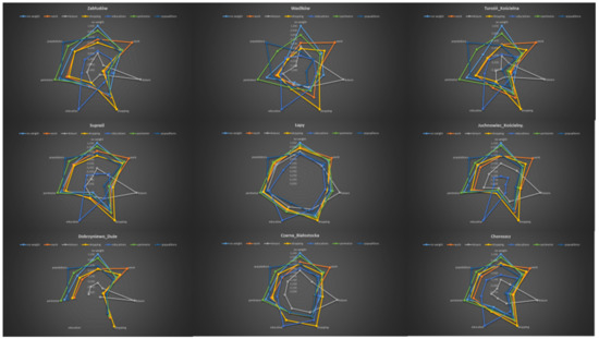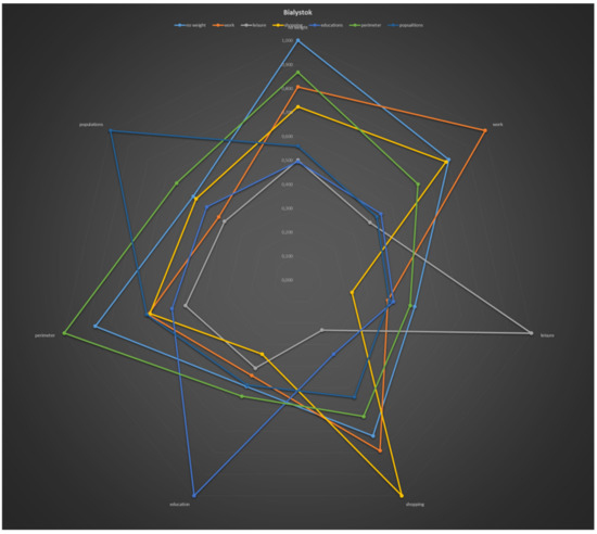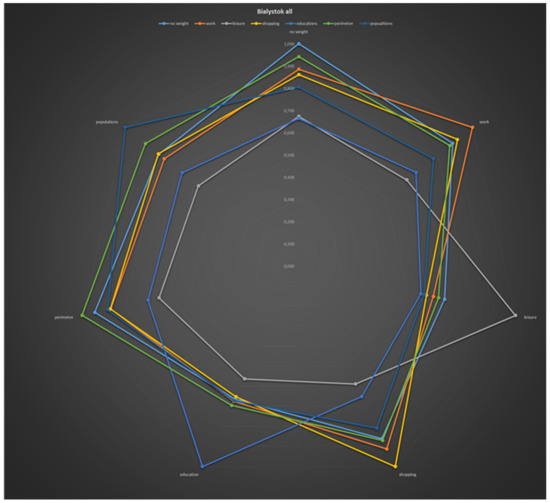 Calculated zones of attraction (Table 2, Figure 2, Figure 3 and Figure 4) when people move to work, recreation, shopping, and education, and the most intensive zones of spatial urban structure within 1000 m could be related to the optimality of 15 min city or New Urbanism neighborhood concepts. A scatterplot of the zones of attraction according to the functional spheres for Bialystok city is presented in Figure 2. It shows synergies or correlations (Table 2) between gravity fields generated by four types of journeys (work, leisure, shopping, ajd education) within radius 1000 m and two additional calculations: gravity with no specific destinations considered as affected just by the configuration of the street network (no weight) and as destination-marked zones with a higher building and street contact perimeter. The last indicator is based on the World Bank report on walkability [14] and could reveal public space to be more attractive for street culture. The “no weight” calculation could be useful for urban planners focussing just on spatial form while evaluating its effects on sustainability. Gravity fields of each type of journey are represented by the accordingly named line in the scatterplot while its correlations are reflected by the position of the line of the seven axes. Because correlations between the same innovators are always one, each line reaches the maximal position at least on one axe which marks itself. A more “spiky” and “star shape” scatterplot means less synergy between the gravity fields generated by different journeys. Based on the comparison of the correlations vs. scatterplots, the following neighborhoods could be named as the least multifunctional: Dobrzyniewo Duże, Choroszcz, Juchnowiec_Kościelny, Turośń_Kościelna, and Wasilków. Zabłudów, Łapy, Czarna_Białostocka, Supraśl, and Bialystok city could be named as more multifunctional neighborhoods.