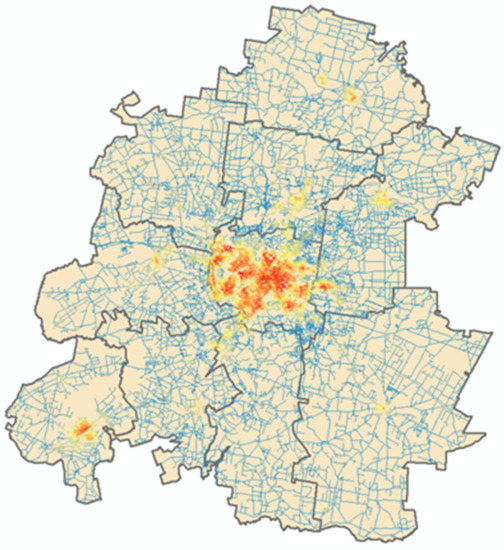 The validation of the modeling results demonstrated that a generic space syntax model both at the level of the neighborhood (radius 1000) and the whole area (radiuses 5000 and 15000) work very well. Results of the statistical analysis of correlations between the density of POIs, inhabitants, and four space syntax indicators are presented in Table 1. The weakest correlations are between the simulated transit flows (Choice in Space Syntax) and POIs density with inhabitant density. Even if moderate correlations were observed at the local level (radius 1000) and it could be considered as not very strong, but sufficient for validation of the model, the absence of better results with global transit (radius 5000 m) could be explained by a very well developed road network in the area, thus creating a lot of alternative routes for journeys inside the region. Strong correlations were observed with so-called closeness centrality represented by Integration in the space syntax or Gravity in the presented investigation and density of street segment nodes in the network. In both cases, correlations demonstrated high values with a slightly higher result for street segment node density (node count). Based on these results, the simulative model was considered as valid and the integration of gravity chosen for the modeling and node count do not represent a simulation of the movement of people.