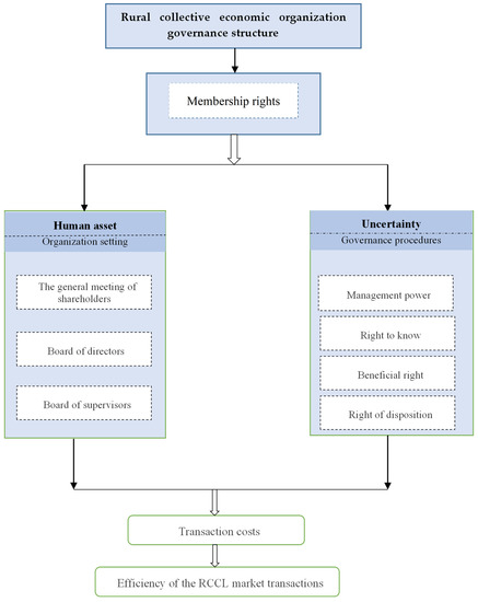Each member of a rural collective economic organization enjoys typical comprehensive membership rights of identity, property and management characteristics [10,11,12]. According to the power of ownership, the collective member rights are divided into the right to participate in management, the right to know, the right to benefit and the right to dispose [13]. Among these, the right to participate in management provides participating groups with the right to express their opinions and participate in activities as members [14]. The right to know ensures that members can effectively participate in the collective by understanding and strictly following the regulations of the organizations for RCCL transaction [15]. The collective members have the right to make a request regarding sharing interests of RCCL transfers [16]. The right of disposition allows members to withdraw from the collective economic organization or give up their own rights through legal means. Members can only dispose of their own identity and rights as individuals, and cannot dispose of the rights of other members or the collective property. If they wanted to manage collective assets, they would need a statement of approval from other members. The governance structure of rural collective economic organizations is characterized by integrity, hierarchy and power. Integrity means that rural collective economic organizations should invest in people’s willingness to protect the interests of their villages by appointing a board of directors, shareholders’ meetings, a board of supervisors, shareholder representatives and owner representatives. Thus, the governance structure of rural collective economic organizations must establish and maintain a reasonable system of processes for effective operation [17,18,19].