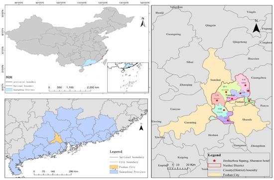 As shown in Figure 2, Nanhai District is located in Foshan City, Guangdong Province. The study area comprises seven townships and 274 villages. We chose Nanhai District as our study area because it was the first region to implement the national land shareholding system. In this district, the rural shareholding cooperatives are made up of the economic cooperative and economic joint community [26]. The economic joint community is composed of several economic cooperatives; there are generally 171–1479 shareholders in each economic cooperative, and there are around 1493–11,000 shareholders in an economic joint community.