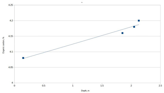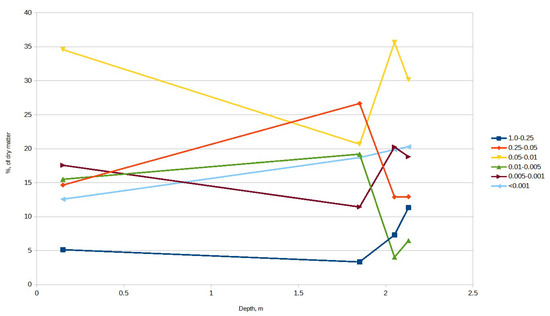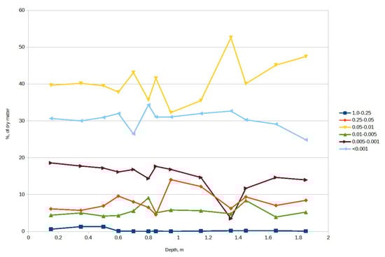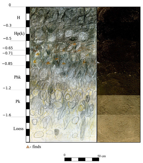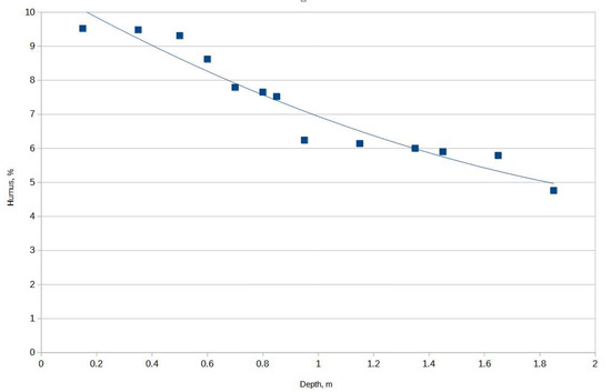 Under the arable layer (Figure 5), there was the upper soils (0.0–0.57 m), transitional horizon (0.75–0.80 m), the lower soil (0.8–1.7 m) with genetic horizons (H(p)k, Hpk, Phk, Pk), and the mother-rock (Pk)—white pale loess (1.7–2.0 m and below). The soils are made of terrace deposits of the Mohylna river valley. The soil profile is saturated by CaCO3 from the very surface to the bottom of the section in the shape of solved carbon and many micellar carbonates. Humus distribution (Figure 6) and granulometric composition (Figure 7) reflect several cycles of pedogenesis. The modern soil is gleyic chernozem, with micellar carbonates and a deep humic horizon. The finds of Early Trypillian artefacts were detected in the horizon 0.65–0.9 m deep. The same observation was made during an extensive archaeological test-trenching [34]. Thus, Trypillian activity happened on the surface of the lower soil. The process of soil formation can be reconstructed as follows (from bottom to top):