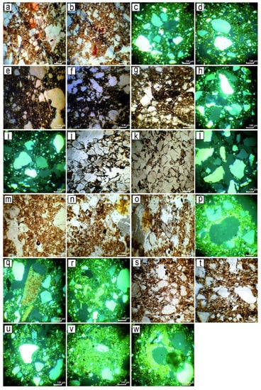 Kamyane-Zavallia. Soil micromorphology. Captions: see Supplementary Table S1. (a,b,e–g,j,k,m–o,s,t)—PPL (plane-polarised light); (c,d,h,i,l,p–r,u–w)—XPL (cross-polarized light). Magnification 1:70. Elaboration—ZM.