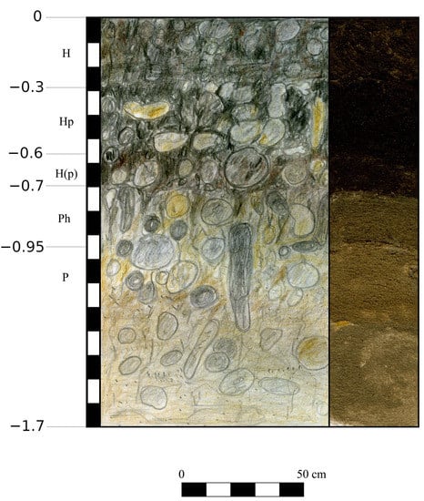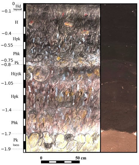 Sections revealed a complex soil sequence up to 4 m deep. There are three consecutive pedogenesis cycles, reflected in respective soils with developed profiles. The upper soil (0.0–0.85 m) comprises four genetic horizons (Supplementary Table S4, Figure 11, Figure 12 and Figure 13) and is clearly separated from the underlying sediments by a well-visible lighter horizon of light dusty loam. The middle soil (0.85–1.7 m) is a light loam with upper horizons rich in humus formed on the lower horizons of light yellow color and loess-like texture. In the excavation pits the horizons corresponding to the middle soil contained artefacts of Eneolithic (the late 5th–early 4th mill. BC, definition of N.S. Kotova [21]). The lower soil (1.7–1.9 m) is a light sandy loam with humus-rich upper horizon—Hpk (gl)—1.7–1.9 m—humus horizon with interchanging layers of grey and brownish-grey stripes 5–7 cm wide. The stripped pattern indicates periodic flooding. In the vicinity of Melnychna Krucha, accumulative processes shaped the formation of a high meadow plain from alluvial material with partial redeposition of the latter under the subaerial conditions. It resulted in the development of a soil sequence thicker than the soils of similar age in the higher river terraces and watershed plateaus. The active deposition enabled us to define three soils separated by illuvial carbonate horizons.