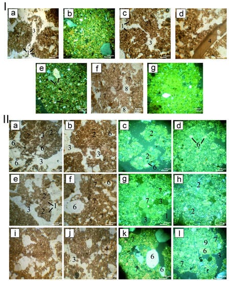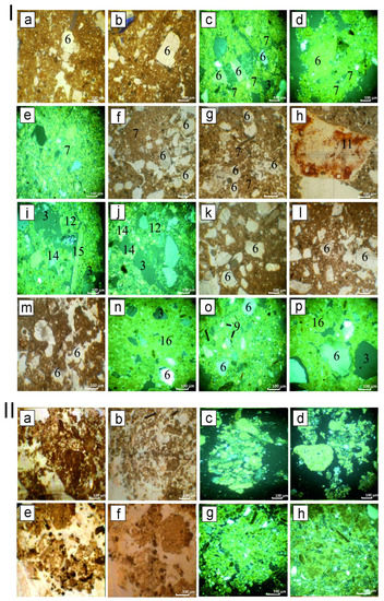 Melnychna Krucha. Micromorphology. I—lower soil of the section 1, (a,b,f–h,k–m)—PPL; (c–e,i,j,n–p)—XPL. II—soils of the section 2. Captions: see Supplementary Table S4. Left column: soil horizons’ indices; central column: schematic drawing; right column: photos of the actual soil textures from the respective horizons of the section. (a,b,e,f)—PPL, (c,d,g,h)—XPL. Magnification 1:70. Elaboration—ZM.