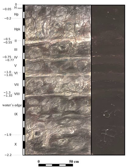 Section 2 revealed the same sequence but distorted by a pit of Neolithic (pit 1/9 of excavation trench 1). This pit and other pits in excavation trench 1 were traced from −0.55 m–0.6 m depth from the lower part of the horizon Hp(k). The modeling of artifact distribution in three dimensions confirms this observation [56]. The stone pavement of Linear Pottery culture was found by pit 1. The foundations of stones stood at the same depth [20]. In section 1, the sparse finds of Neolithic potsherds came from the same depth. Thus, the horizon of Neolithic activity corresponds to the lower part of the horizon Hp(k). So, the soil of LPC was reworked by further pedogenetic processes and the LPC remains were covered by the younger soil. However, it left a visible trace: humus shells of mineral grains were observed in thin sections of the sample coming from this layer. One of the authors (Zh.M.) reconstructs the soil of the Neolithic period as chernozem with three horizons H, Phk, Pk, 0.6–0.7 m thick. While the exact character of this soil is not yet apparent, it is evident that it contained a high content of humus, being arable, at least as the modern soil is. Moreover, considering that the analyzed sample comes from the horizon covering the layer of Neolithic activity (0.65–0.75 m), these observations can also relate to younger phases of the Neolithic, which are consistent with the results obtained in the nearby Trypillian settlement of Kamyane-Zavallia 1.