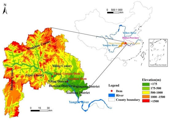 The TGRA-HS is located in the middle reaches of the Yangtze River in the southwest of Hubei Province (30°14′–31°34′ N, 110°06′–111°40′ E) and includes three counties (Badong, Zigui, and Xingshan counties) and five districts (Yiling, Dianjun, Xiling, Wujiagang, and Xiaoting districts) (Figure 1). It has a population of about 2.82 million and an area of about 1.21 × 104 km2. The Hubei section is the reservoir head of the TGRA, and the landform types are complex and diverse, with more mountains and fewer plains. The mountains are high, the slopes are steep, and the valleys are deep. The climate is affected by topographic fluctuations, and the natural vegetation has the characteristics of vertical zoning. The dam site of the TGP is located in Sandouping Town, south-west of Yichang City, Hubei Province, China. The Gezhou dam, which is the regulating dam of the Three Gorges Dam, is located 38 km downstream. Since 1990, with the continuous advancement of the TGP and various ongoing construction projects, the PLES in the TGRA-HS have changed significantly and human activities have strongly interfered with the regional eco-environment. Under the dual drive of policy and economy, the land use pattern of the TGRA-HS has undergone significant changes, and the land use function has also undergone a transformation. In addition, due to the phased implementation of the TGP, the main projects have caused distress, such as the resettlement of immigrants, the submersion of water storage, and the relocation of facilities. This has further intensified the complexity of the study of regional ecological effect changes. The spatiotemporal characteristics of LUFT and the characteristics of the eco-environmental response show significant differences before and after the dam’s construction [43,44].