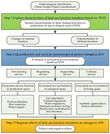 Different types of land use have various functions. Analyzing the evolution of spatial form and the structure of territorial space is an important way of exploring the process of space function change. One of the manifestations of the land use transition is the transformation between the three leading functions of production, living, and ecology [45]. Under different leading functions (spatial types), human beings have different impacts on the ecosystem, and the services provided by the ecosystem for human society are also significantly different. In general, anthropogenic interference (such as a large-scale construction project) will lead to the transformation of the three leading functions. The structure of PLES tends to be unbalanced, and thus, affects the components, structure, service value, and function of the ecosystem. It leads to changes in the supply capacity of regional ecosystem services and becomes the most direct driving factor affecting the function and value of ecosystem services [46,47]. This study was carried out according to the logic of the construction stage division of the TGP, the characteristics of LUFT, the spatiotemporal change in ESV, and the effects of LUFT in terms of changes in ESV (Figure 2). Thus, a framework of LUFT and its effects in terms of changes in ESV from the perspective of PLES in the TGRA-HS was developed as follows: