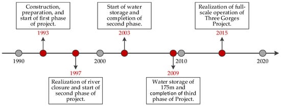 According to the stage deployment, the construction of the TGP can be divided into stages, such as the construction preparation and start of the first phase of the project (1993), the realization of the river closure and the start of the second phase of the project (1997), the start of water storage and the completion of the second phase of the project (2003), water storage of 175m and the completion of the third phase of the project (2009), and the realization of the full-scale operation of the TGP (2015) (Figure 3). There were obvious differences in the spatial pattern of PLES and its variation trend before and after the dam construction. However, it was difficult to carry out eco-environmental monitoring and change analysis in the whole process of project construction because of the difficulty of obtaining long-term data. Therefore, this study selected 1990, 2000, 2010, and 2020 as the time nodes to explore the characteristics of LUFT, the spatiotemporal change of ESV, and the effects of LUFT on the change in ESV from the project demonstration to the full operation stage according to the construction stage division of the TGP and the availability of data.