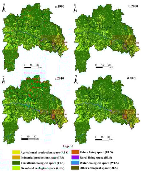 (1) The transition of land use function from the perspective of PLES is the mapping of the evolution of the human–nature relationship in the spatial pattern, which reflects the evolution of the spatial pattern caused by human interference with the continuous development of society.