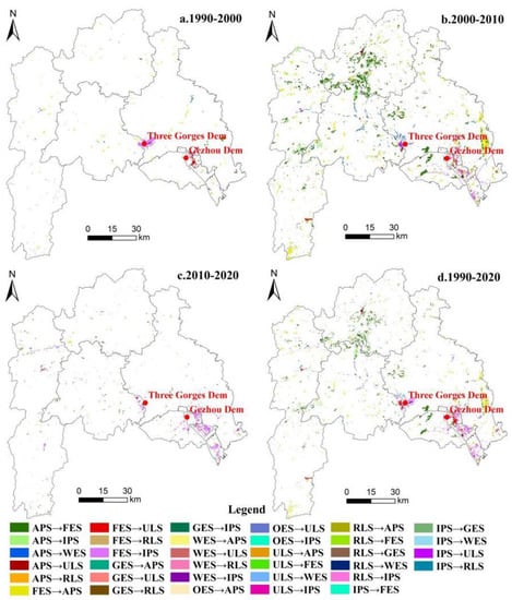 For a further intuitive analysis, the structural transformation of the land use function in the TGRA-HS from 1990 to 2010 was calculated based on the mathematical model of LUFT. Compared with the data of the base period in 1990, the IPS and ULS increased significantly, and the growth rate was more than 85% during the study period (Table 5). Meanwhile, the FES and GES only showed minimal changes, and they were almost the same as the data of the base period. The differences in the spatial distribution characteristics of structural transform in different phases were obvious and were mainly reflected in the conversion of P-space and E-space in the TGRA-HS. From 1990 to 2000, the mutual conversion area was 6679.08 hm2, which was mainly reflected in the conversion of APS, FES, and IPS, with a proportion of 70.84% of the total converted area. At this stage, the TGP and the resettlement of immigrants in the reservoir area had been implemented on a grand scale, resulting in the conversion of a large number of FES into IPS and APS. From 2000 to 2010, the mutual conversion area was 37,480.27 hm2, which was mainly reflected in the conversion of APS and FES, accounting for 66.88% of the total converted area during this period. The Grain for Green Project (GGP) was implemented, which resulted in a large amount of cultivated land being converted to forestland. At this stage, the Three Gorges Dam was officially closed for water storage, and the water level rose from 135 m to 175 m. This led to the transformation of an important proportion of APS into WES. Meanwhile, the mutual conversion area was 5916.48 hm2 from 2010 to 2020, which was mainly reflected in the conversion of FES and IPS, accounting for 78.06% of the total converted area in the TGRA-HS. They were mainly concentrated in the urban area of Yichang around the Three Gorges Dam and the Gezhou Dam (Figure 5).