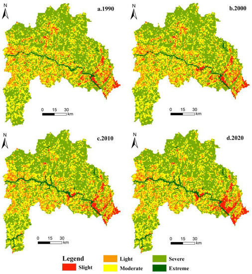 According to the calculation results, the spatial characteristics of the ESV change in the TGRA-HS between 1990 and 2020 were obtained (Figure 6). The spatial pattern of the slight ESV area in the TGRA-HS was mainly distributed in the urban built-up area. It showed an obvious expansion trend with the development of urbanization and the construction of the TGP. The distribution pattern of the light and moderate ESV area was consistent with the spatial distribution of cultivated land, and most of them had been replaced by slight areas during the past 30 years. The spatial pattern of the severe ESV area was basically the same as the distribution of forestland. Additionally, the characteristics of spatial distribution tended to be fragmented from 1990 to 2020, which was related to the encroachment of forestland by construction land. The distribution pattern of extreme ESV area was consistent with the river. The population distribution in this region was relatively concentrated along the river banks with deep valleys and steep slopes, and the area of sloping farmland was large. People’s daily life and agricultural production activities had destroyed the vegetation along the coast, causing serious water and soil loss.