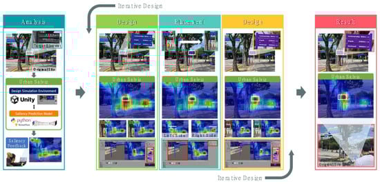 To address this issue, researchers have involved citizens in the design process, allowing them to have a say in the landscapes they will ultimately use. This engagement is usually focused on the initial or final stages of design to assess whether a design is effective. A similar approach has been applied to wayfinding design, with methods such as surveys, workshops, and interviews for gaining feedback on proposed designs [10,11,12]. Newer methods, such as crowd rating [13] and eye tracking [14,15], have also been used for quantitative evaluation. However, these methods are limited, as designers cannot see the impact of design changes in real time. Visual saliency can provide a solution, as it can give immediate feedback on how users engage with the design, allowing for real-time simulation during the walking and navigation of pedestrians.