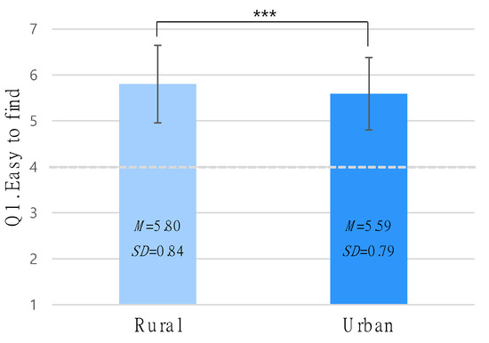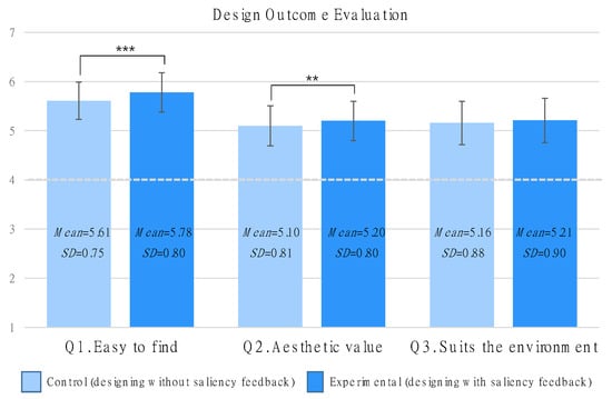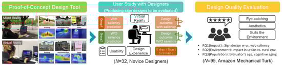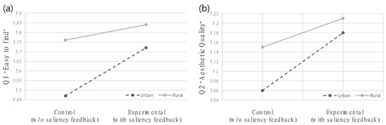 The visual and structural characteristics of environments affect the ease of wayfinding [42,43]. Urban environments contain more visually distracting elements, such as buildings, signs, and other spatial elements, than the rural countryside. For example, Costa et al. [44] found that drivers fixate on road signs significantly more in rural areas than in urban areas. The increased complexity and likelihood of distraction pose another challenge to predicting where users will pay attention. In addition, with regard to visual complexity and distraction, the design outcome should compete for end users’ attention—particularly in urban areas. Thus, we hypothesized that end users would find the designs produced using our method more effective for urban areas than for rural areas.