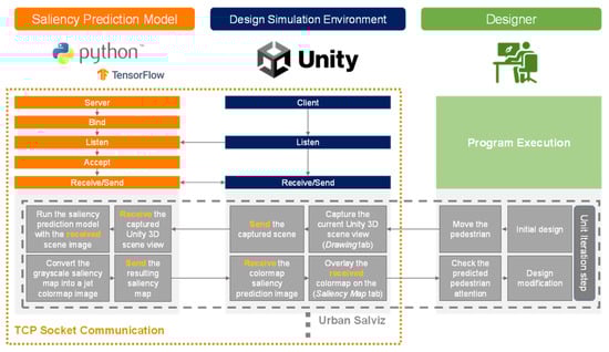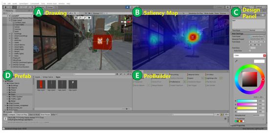 The implementation of the function involves capturing a real-time video of the graphical scene view (Drawing tab, Figure 3A) through the TCP protocol and feeding it into the Python environment. The Python part then employs a deep-learning model to generate a saliency map of the scene view, which is imported into the Saliency Map (Figure 3B) in the Unity 3D environment.