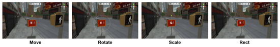 Drawing. Users can alter the design of the urban elements in the Drawing Table. This tab is based on the Scene view of Unity 3D; thus, it includes the transform components of the tool. Users can transform objects in the X, Y, and Z directions (Figure 4, Move); rotate objects around the X, Y, and Z axes (Figure 4, Rotate); scale objects along the X, Y, and Z axes (Figure 4, Scale); and stretch objects along the X and Y axes (Figure 4, Rect). Users can either select virtual-reality (VR) environments or load a camera input for video through mixed-reality applications.