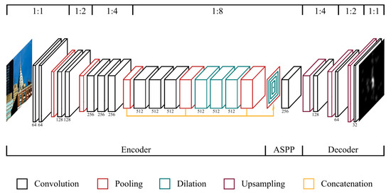 To accurately predict the saliency of the cityscape, we incorporated MSI-Net (Figure 5) [19] owing to its performance on the MIT Saliency Benchmark [51,52]. MSI-Net uses an encoder–decoder structure with convolutional layers to capture features at multiple spatial scales. The encoder network processes the input image and extracts relevant features, and the decoder network uses the encoded features to generate the final predicted saliency map. The model used in this study was able to assess the visual saliency of arbitrary urban and rural environments with wayfinding signs by learning the aggregated visual attention paid to 10,000 images of both types of environments from the SALICON dataset [53] (Figure 6).